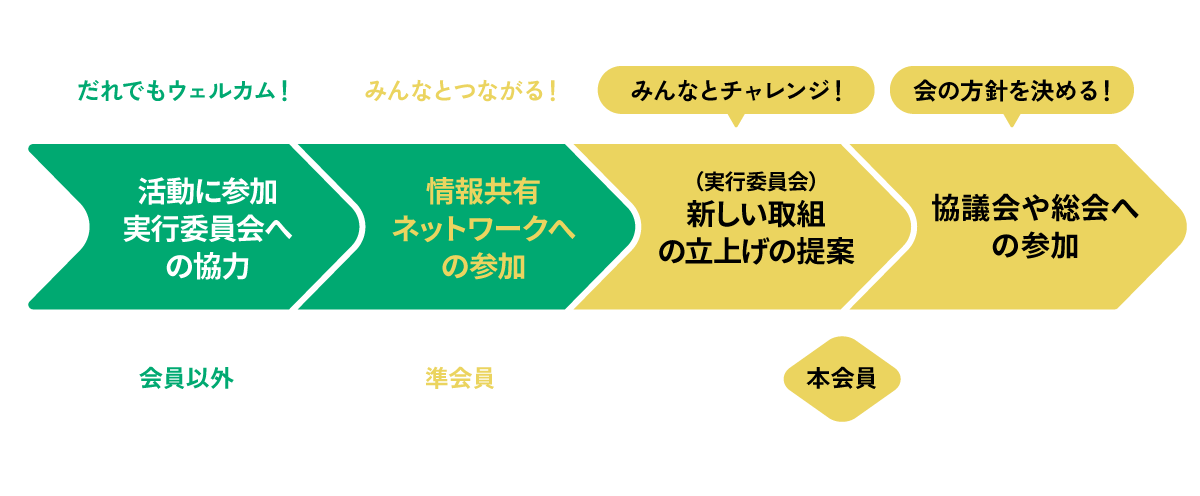 ご自身や団体の活動状況に合わせて、本会員、準会員、会員以外の3つ方法で本会の活動に参加することができます。